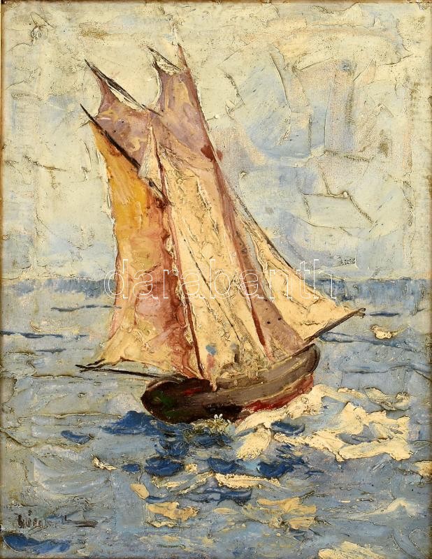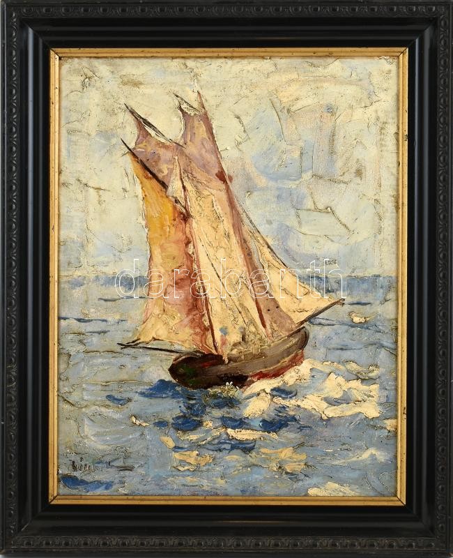 Leírás: Olvashatatlan jelzéssel, feltehetően a XX. sz. elején működött festő alkotása: Vitorlás. Olaj, vászon. Régi fa keretben. 49x38,5 cm