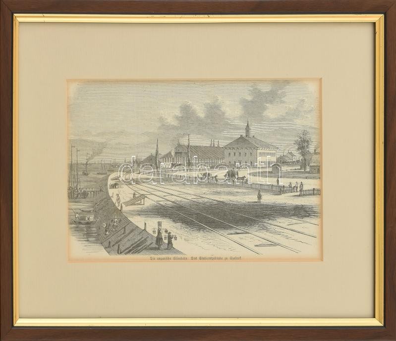Leírás: cca 1870 Szolnoki vasútállomás fametszetű kép e üvegezett keretben 11x18 cm