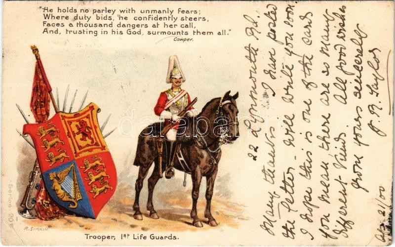 1900 Trooper, 1st Life Guards. British Army. Series 20. coat of arms,... https://www.darabanth.com/hu/403-Gyorsarveres/403.0/Kepeslapok/Katonai~1000069/1900-Trooper-1st-Life-Guards-British-Army-Series-20-coat-of-arms-litho-s-R-Simkin-EK~II2158376
