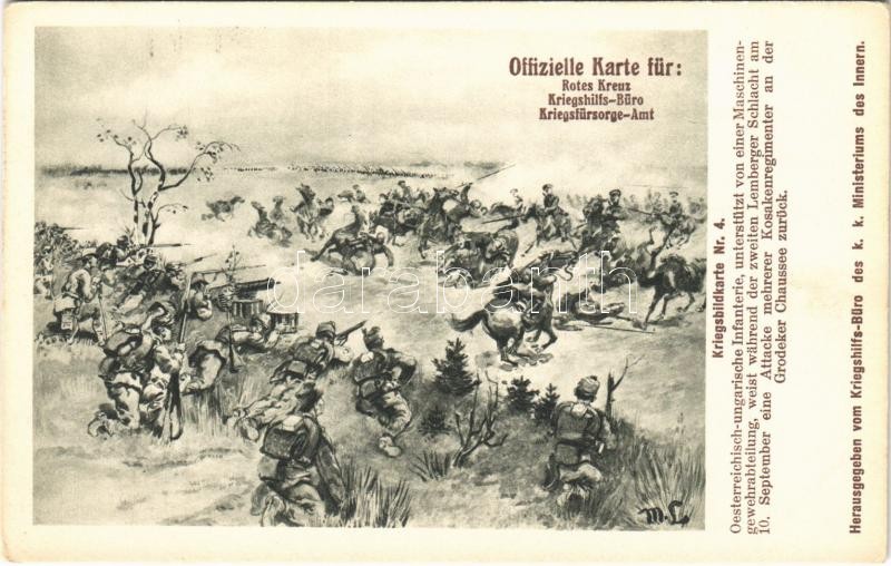 1914 Kriegsbildkarte Nr. 4. Oesterreichisch-ungarische Infanterie, unterstützt von einer Maschinengewehrabteilung, weist während der zweiten Lemberger Schlacht am 10. September eine Attacke mehrerer Kosakenregimenter an der Grodeker Chaussee zurück. Offizielle Karte für Rotes Kreuz, Kriegshilfsbüro, Kriegsfürsorgeamt / WWI Austro-Hungarian K.u.K. and German military art postcard. Austrian-Hungarian infantry, supported by a machine-gun division, rejects an attack by several Cossack regiments near Gródek (Horodok, now Ukraine) during the second Battle of Lemberg (Lviv, Lwów) on 10 September 1914 s: M. Ledeli (EK)