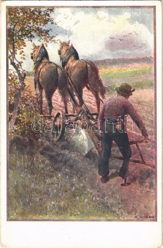 Ackersmann aus den Invalidenschulen. Offizielle Karte für Rotes Kreuz, Kreigsfürsorgeamt Kriegshilfsbüro Nr. 531. / WWI Austro-Hungarian K.u.K. military art postcard, one-legged farmer from the school for people disabled in the war s: R. Moser (EK)