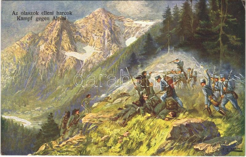 Az olaszok elleni harcok / Kampf gegen Alpini / WWI Austro-Hungarian K.u.K. military art postcard, battle against the Italian mountain troops s: F. Höllerer (EK)