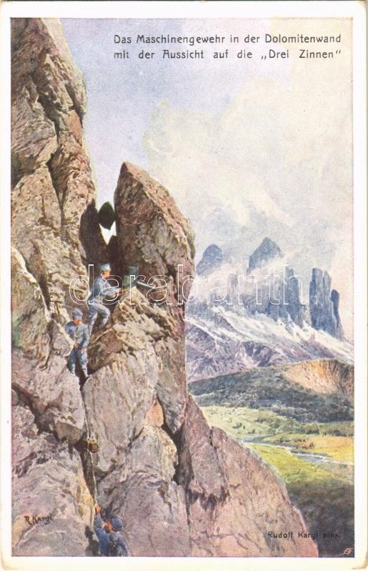 Das Maschinengewehr in der Dolomitenwand mit der Aussicht auf die "Drei Zinnen". Offizielle Karte für Rotes Kreuz, Kriegsfürsorgeamt, Kriegshilfsbüro Nr. 211. / WWI Austro-Hungarian K.u.K. military art postcard, soldiers with machine gun, view of the Drei Zinnen (Tre Cime di Lavaredo, Südtirol) s: Rudolf Kargl (EB)