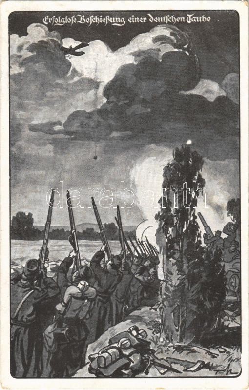 Erfolglose Beschießung einer deutschen Taube / WWI German military art postcard, unsuccessful bombardment of a German military aircraft. Deutscher Luftflotten-Verein