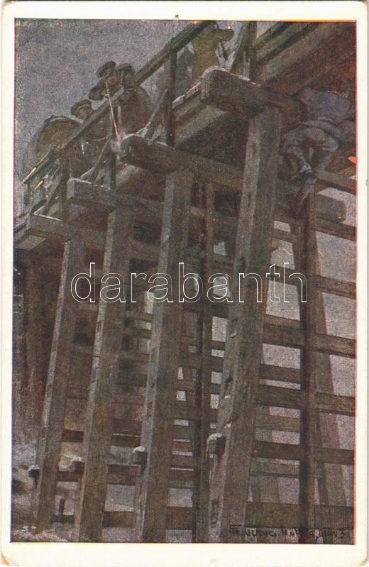 Leutnant Emil Pregragovic des Pionierbataillons Nr. 7. befestigt von den Russen heftig beschossen, die Sprengladung an dem Fachwerke der Bialabrücke, deren Vernichtung er später durch Brandlegung vollendete. Rotes Kreuz Kriegshilfsbüro Nr. 579. Aus dem goldenen Buche der Armee Serie VI. / WWI Austro-Hungarian K.u.K. military art postcard, support fund s: Fr. Jung (EK)