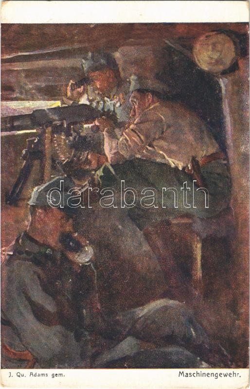 Maschinengewehr. Offizielle Karte für Rotes Kreuz, Kriegsfürsorgeamt, Kriegshilfsbüro Nr. 338. / WWI Austro-Hungarian K.u.K. military art postcard, machine gun s: J. Qu. Adams (EK)