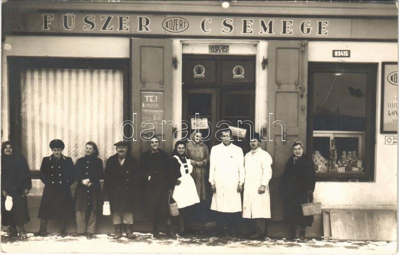 Ismeretlen település, Közért, fűszer és csemege üzlet. photo https://www.darabanth.com/hu/403-Gyorsarveres/403.0/Kepeslapok/Magyarorszag~1000005/Ismeretlen-telepules-Kozert-fuszer-es-csemege-uzlet-photo~II2480579