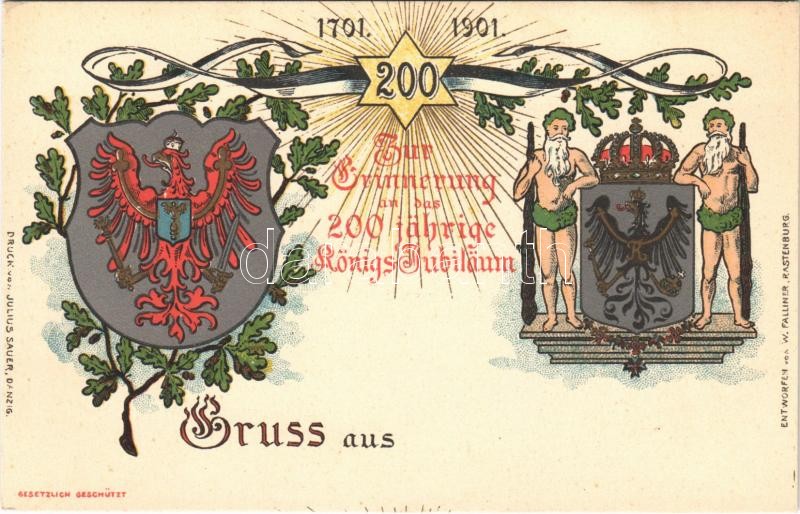 1701-1901 Zur Erinnerung an das 200 jährige Königs-Jubiläum / To commemorate the 200th anniversary of the Kingdom Of Prussia. Druck v. Julius Sauer (Danzig) Entworfen von W. Falliner (Pastenburg) Art Nouveau, floral, litho with coat of arms