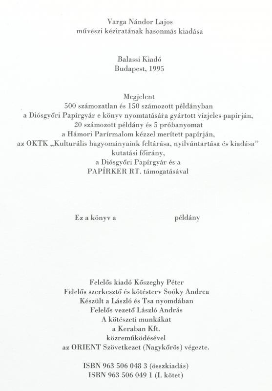 Varga Nándor Lajos: VÃzjegyek I-II. köt. I. köt.: Kézzel merÃtett magyar vagy külföldi magyar vonatkozású papÃrosokon 1330-tól 1896-ig. II. köt.: VÃzjegyek. (1623-1896.) Saját gyűjteményébÅ‘l közre adja, eredeti méretekben fába metszette: - -. Bp., 1995., Balassi, 4+260+1;2+403+1 p. Kiadói álbordás egészvászon-kötés. Hasonmás kiadás. Megjelent 500 számozatlan, és 150 számozott példányban. Számozatlan példány.