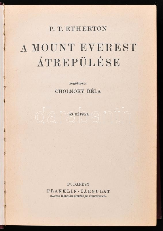 [Etherton, Percy Thomas (1879-1963)] P. T. Etherton: A Mount Everest átrepülése. Fordította: Cholnoky Béla. Magyar Földrajzi Társaság Könyvtára. Bp.,[1935.],Franklin,1 (címkép) t.+262+2 p.+ 21 (fekete-fehér fotók) t. Kiadói dúsan aranyozott egészvászon sorozatkötésben, kissé kopott borítóval.
