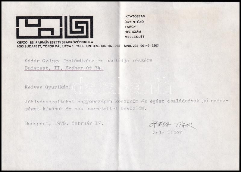 1978 Zala Tibor (1920-2004) Munkácsy Mihály-díjas grafikus, a Képző- és Iparművészeti Szakközépiskola igazgatója (1964-1980) aláírása az iskola fejléces levélpapírjára írt levelén