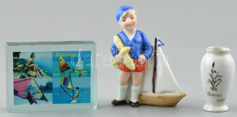Balatoni emléktárgyak, 3 db: Hollóházi mini porcelán váza, m: 5 cm + porcelán kisfiú vitorlással, m: 8,5 cm + üveg papírnehezék, 7,5x5,5x2 cm, kis kopásnyomokkal