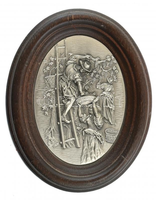 Leírás: Szüreti jelenetet ábrázoló, domborműves ón kép, ovális, kissé sérült fa keretben, külső méret: 15x12 cm