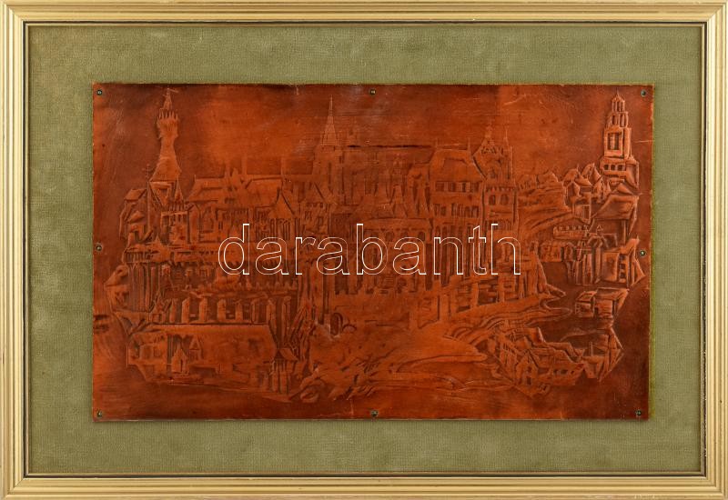 Leírás: Litkei József (1922-1988): Buda. Bőrkép, szövetre applikálva, hátoldalán Vizualart címkén feliratozott, fa keretben, 27,5×45,5 cm