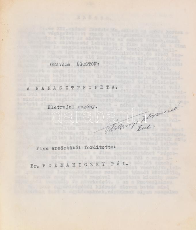 Leírás: cca 1960 Orvala Ágoston: A parasztpróféta. Életrajzi regény. Finn eredetiből fordította br. Podmaniczky Pál. Gépelt kézirat 373p. Bekötve
