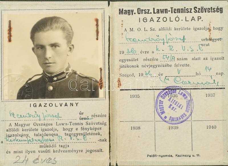 1936 Magy. Orsz. Lawn-Tennisz Szövetszég fényképes igazolvány + 1953-5... https://www.darabanth.com/hu/403-Gyorsarveres/403.0/Mutargy-papirregiseg-egyeb/Okmanyok~500018/1936-Magy-Orsz-Lawn-Tennisz-Szovetszeg-fenykepes-igazolvany-plus-1953-54-MAV-fenykepes-igazol~II2479154