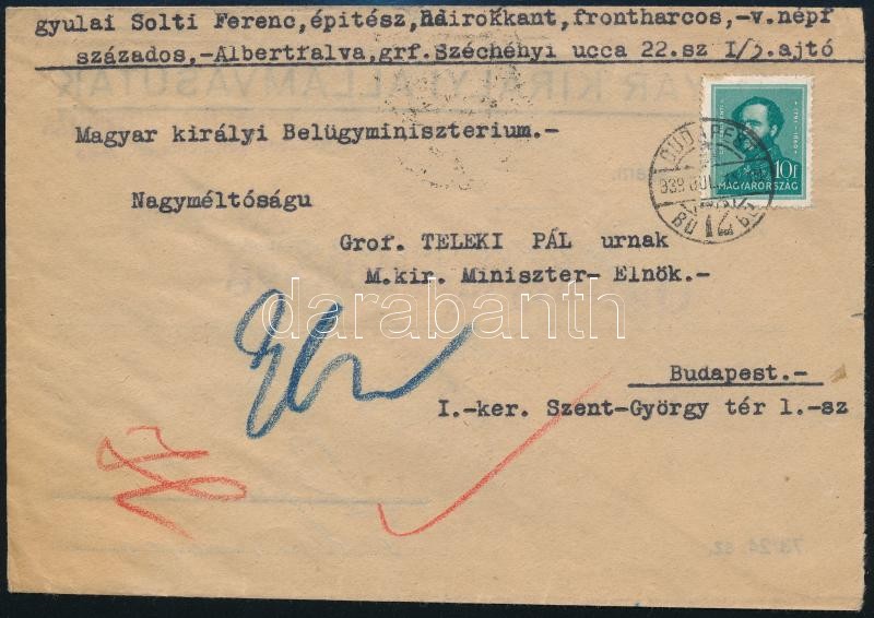 1939 Gr. Teleki Pál (1879-1941) miniszterelnöknek címzett boríték https://www.darabanth.com/hu/403-Gyorsarveres/403.0/Mutargy-papirregiseg-egyeb/Okmanyok~500018/1939-Gr-Teleki-Pal-1879-1941-miniszterelnoknek-cimzett-boritek~II2478575