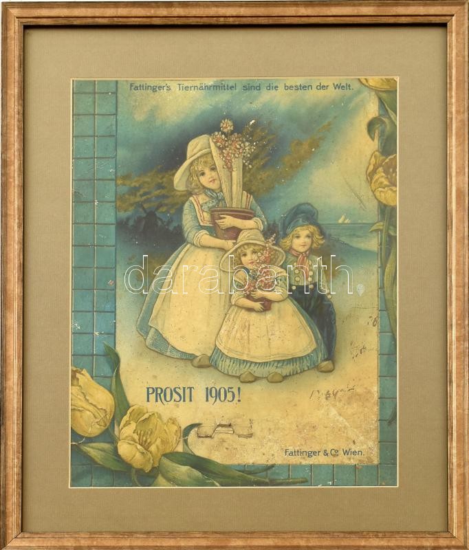 Leírás: 1905 Fattinger bécsi cég szecessziós újévi reklám nyomtatvány. Litográfia, papír. Sérült. Üvegezett fa keretben. 30x23,5 cm.