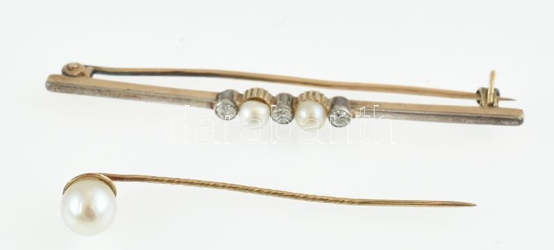 Leírás: 14k Arany (Au) Bross (brillekkel cca. 0,3 ct és édesvízi gyönggyel ékítve) és kalaptű. bruttó: 4,95 g. Jelzés nélkül. bross h: 6 cm