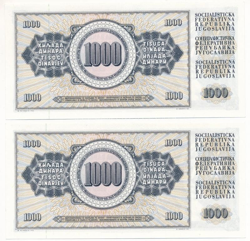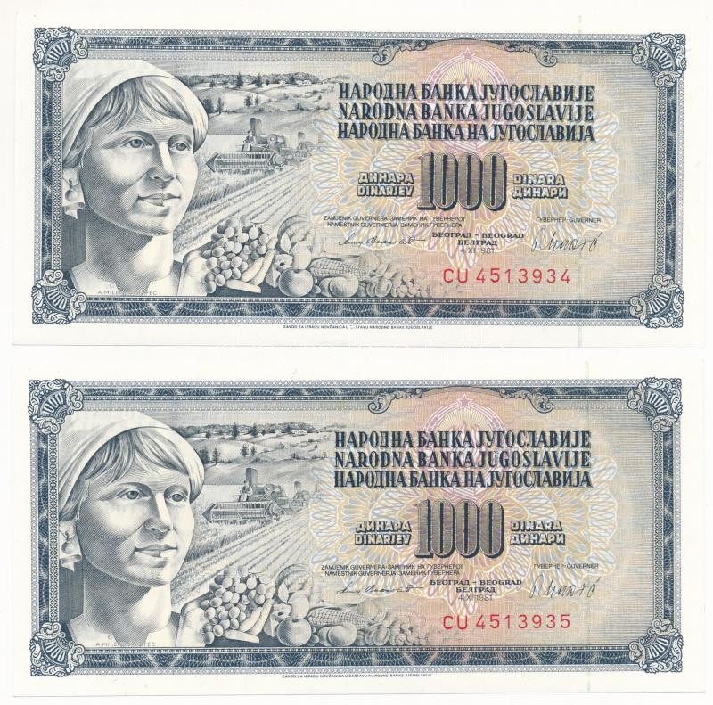 Yugoslavia 1981. 1000 Dinara (63x) consecutive serials "CU 4513934 - CU 4513935" C:UNC