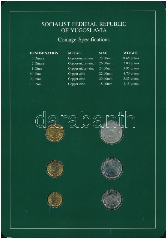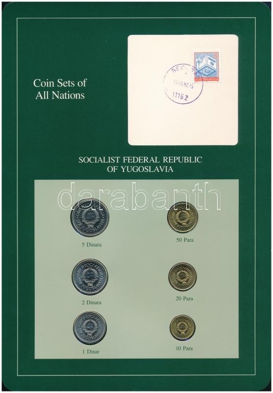Jugoszlávia 1990-1991. 25p-10D (6xklf), "Coin Sets of All Nations" forgalmi szett felbélyegzett kartonlapon T:1 Yugoslavia 1990-1991. 25 Para - 10 Dinara (6xdiff) "Coin Sets of All Nations" coin set on cardboard with stamp C:UNC