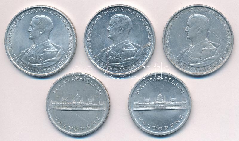 1943. 5P Al "Horthy Miklós születésének 75. évfordulója" (3x... https://www.darabanth.com/hu/403-Gyorsarveres/403.0/Numizmatika/Magyar-es-magyar-verdejelu-fem-es-ezustpenzek~2500008/1943-5P-Al-Horthy-Miklos-szuletesenek-75-evforduloja-3x-plus-1945-5P-Al-Parlament-2x-T~II2487390