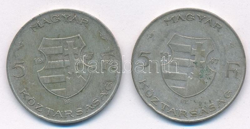 1947. 5Ft Ag "Kossuth" (2x) T: 3 patina Adamo F8.1 https://www.darabanth.com/hu/403-Gyorsarveres/403.0/Numizmatika/Magyar-es-magyar-verdejelu-fem-es-ezustpenzek~2500008/1947-5Ft-Ag-Kossuth-2x-T-3-patina-Adamo-F81~II2487416