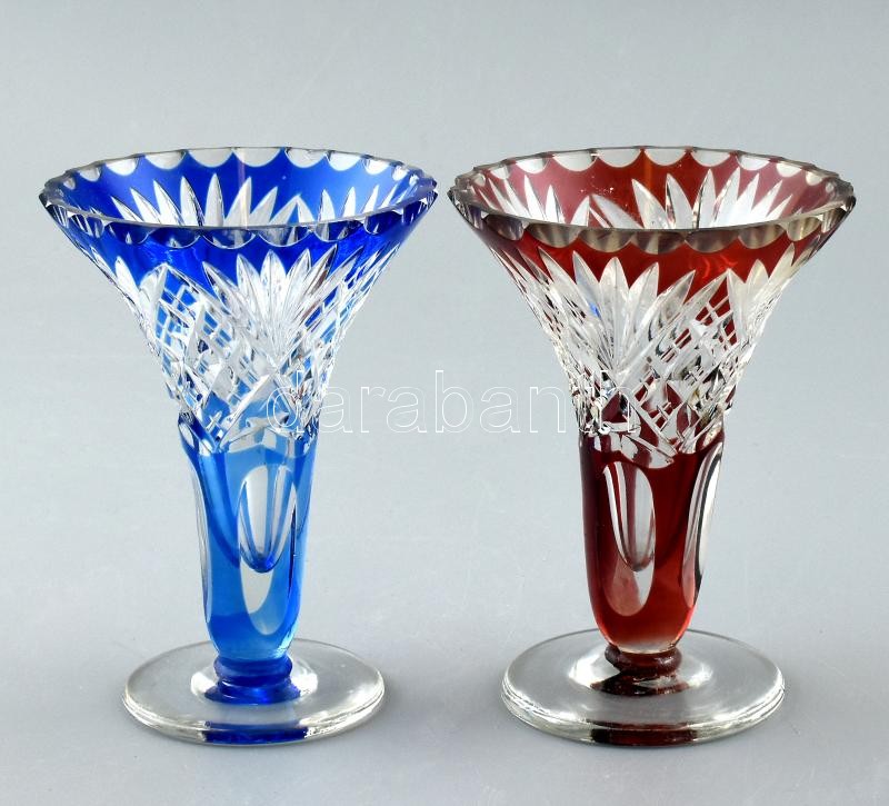 Leírás: 2db kristályváza, kék és bordó, apró csorbák, m:12cm