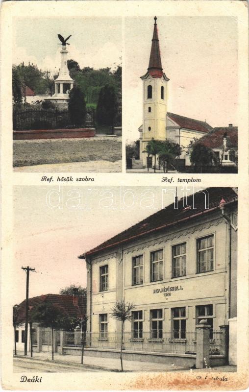 Deáki, Diakovce; Református hősök szobra, Református templom és népiskola. Fogyasztási szövetkezet kiadása / Calvinist church, school and heroes' statue (felületi sérülés / surface damage)