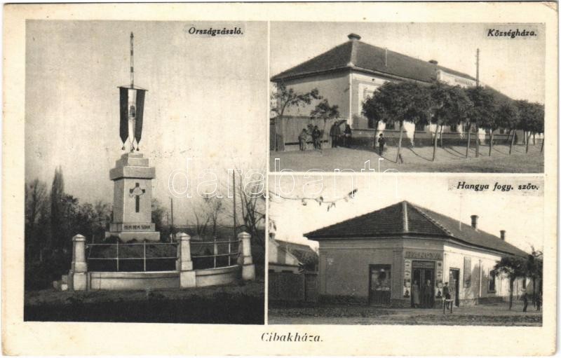 Leírás: 1939 Cibakháza, Országzászló, "Nem, nem, soha!" irredenta felirat, Községháza, Hangya szövetkezet üzlete és saját kiadása (EK)