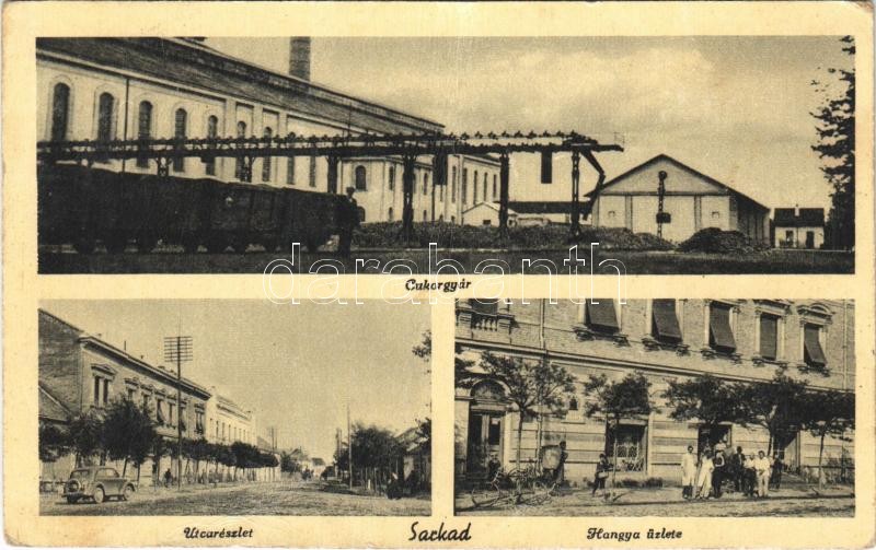 Leírás: 1944 Sarkad, Cukorgyár, iparvasút, utca részlet, automobil, Hangya szövetkezet üzlete és saját kiadása (fa)