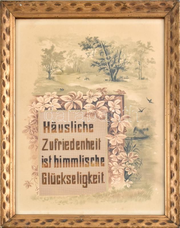 Leírás: Dekoratív, üvegezett régi fa keret német nyelvű hímzett felirattal, litografált paszpartuval, kereten kopásnyomokkal, látható méret: 38,5x28,4 cm