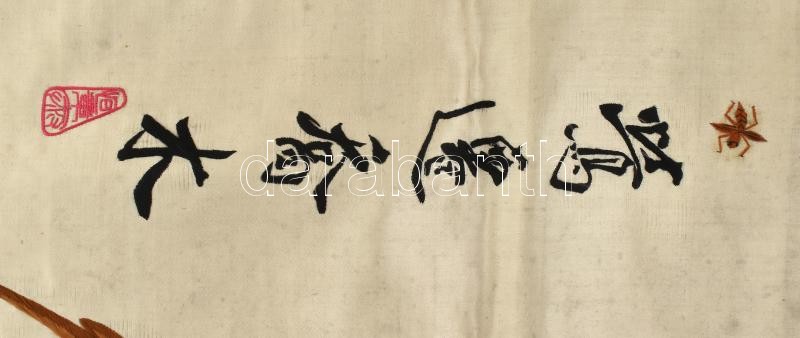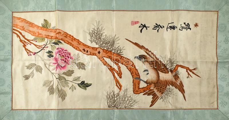 Leírás: XX: sz. eleje. Kínai, hímzett selyem falikép, kézzel festett, jelzett. / Chinese embroidered silk picture. Signed. 44x90 cm