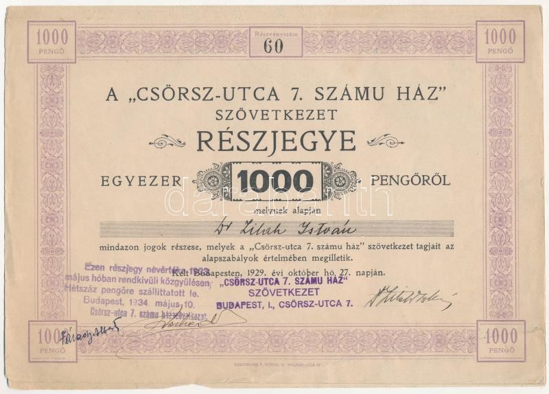 Leírás: Budapest 1929. "A 'Csörsz-utca 7. számú ház' Szövetkezet" névre szóló részjegye 1000P-ről, bélyegzésekkel T:III