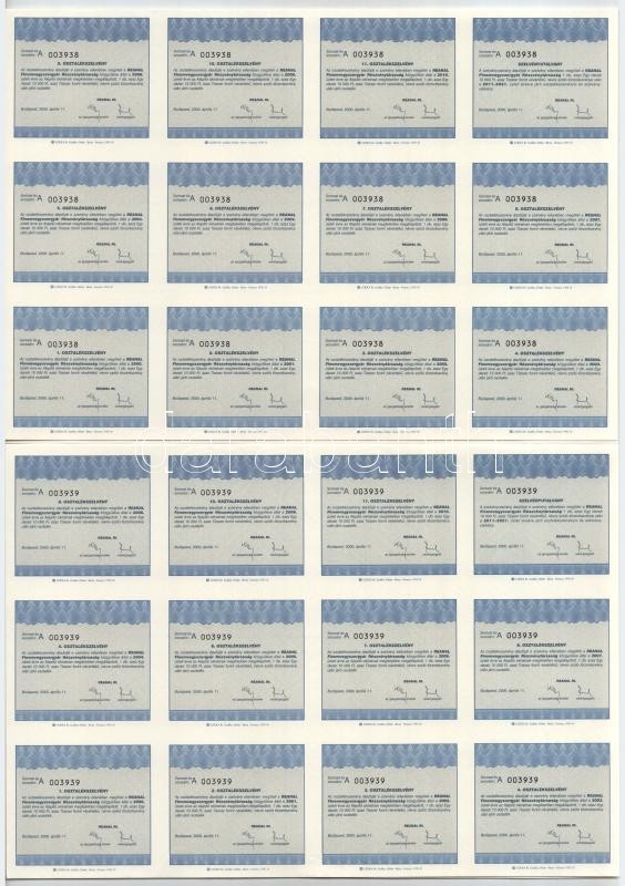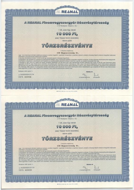 Leírás: Budapest 2000. "Reanal Finomvegyszergyár Részvénytársaság" névre szóló törzsrészvénye 10.000Ft-ról (2x) sorszámkövetők, szelvényekkel T:I-