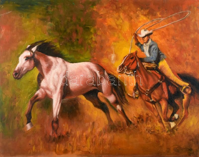 Jelzés nélkül: Cowboy. Olaj, farost, 40x50cm, . https://www.darabanth.com/hu/405-Gyorsarveres/405.0/Festmenyek-es-grafikak/Festmenyek-es-grafikak-jelzessel-jelzes-nelkul~2/Jelzes-nelkul-Cowboy-Olaj-farost-40x50cm-~II2501115