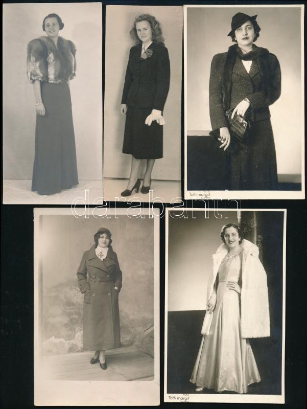 Leírás: cca 1930-1950 Divatos hölgyek, 5 db fotó, 14×5,5 és 13,5×8,5 cm közötti méretekben