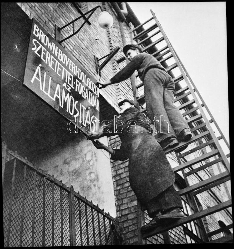 cca 1948 Az államosítást hirdető tábla kihelyezése az üzem utcai homlokzatára, 1 db NEGATÍV Kotnyek Antal (1921-1990) budapesti fotóriporter hagyatékából, 5,5x5,1 cm