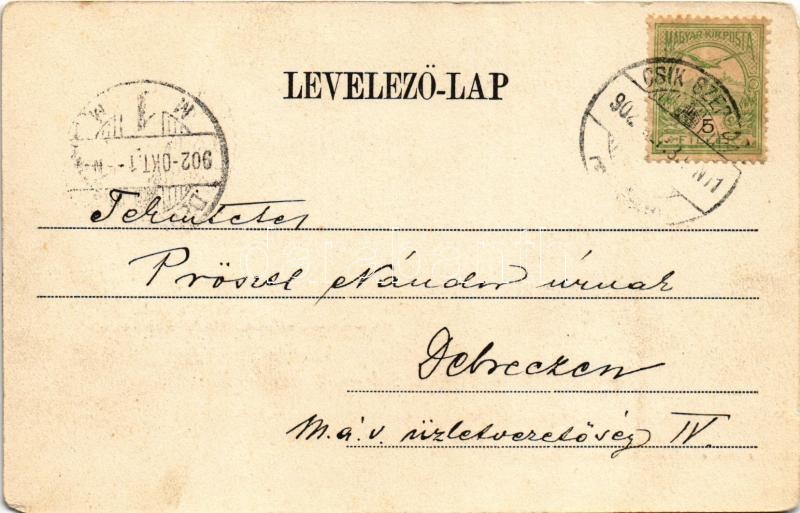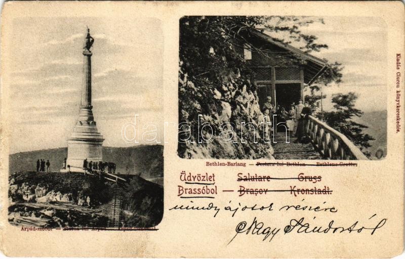 Leírás: 1902 Brassó, Kronstadt, Brasov; Árpád szobor, Millenniumi emlékmű, Bethlen-barlang. Ciurcu könyvkereskedés kiadása / Statua lui Arpad, Pestera lui Bethlen / Arpad-Denkmal, Bethlens-Grotte / Millennium monument, cave (EM)