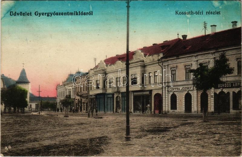 Leírás: 1914 Gyergyószentmiklós, Gheorgheni; Kossuth tér, Borsos Árpád, Cziffra József üzlete / square, shops (Rb)