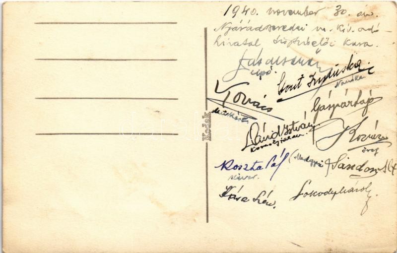 Leírás: 1940 Nyárádszereda, Nyárád-Szereda, Miercurea Nirajului; M. kir. adóhivatal tisztviselői kara. Hátoldalon aláírások / Hungarian tax office officials, signatures on the backside. photo