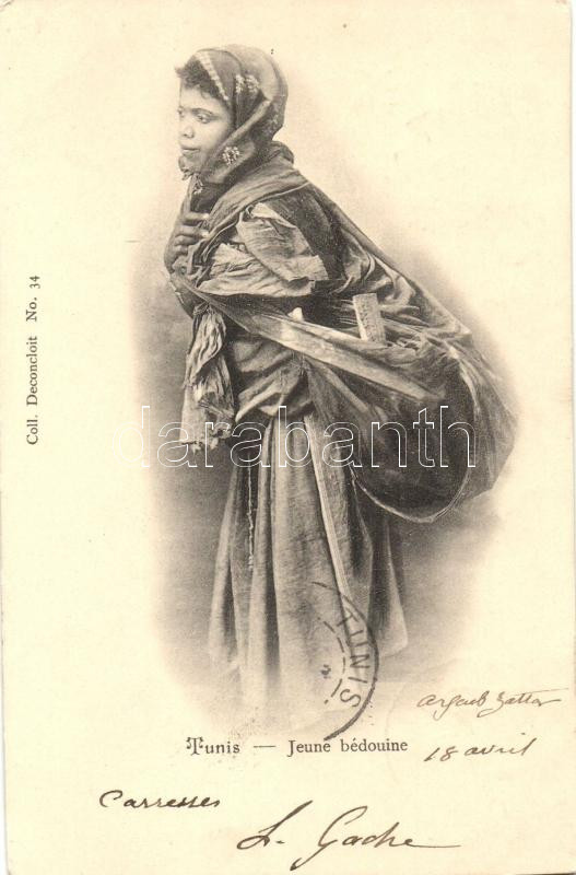 Tunis, Jeune bédouine / Tunisian folklore, bedouin https://www.darabanth.com/hu/405-Gyorsarveres/405.0/Kepeslapok/Folklor~1000069/Tunis-Jeune-bedouine-Tunisian-folklore-bedouin~II1216864