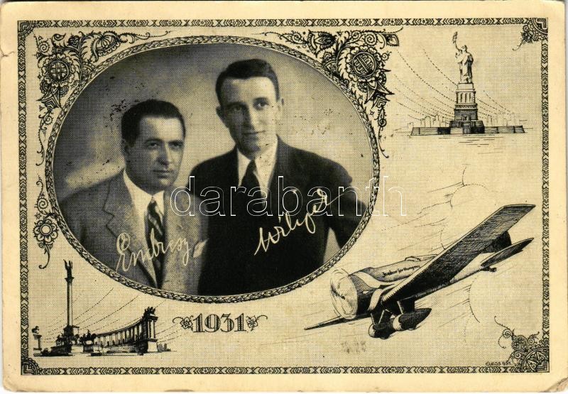 1931 Endresz György és Wilczek (Magyar) Sándor "Justice for Hungary" óceánrepülésének emlékére / Hungarian pilots, memorial card for their flight across the ocean. Irredenta Art Nouveau postcard + "LÉGI POSTA PAR AVION" (EK)