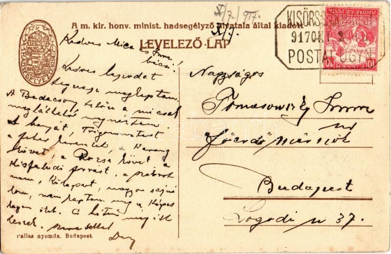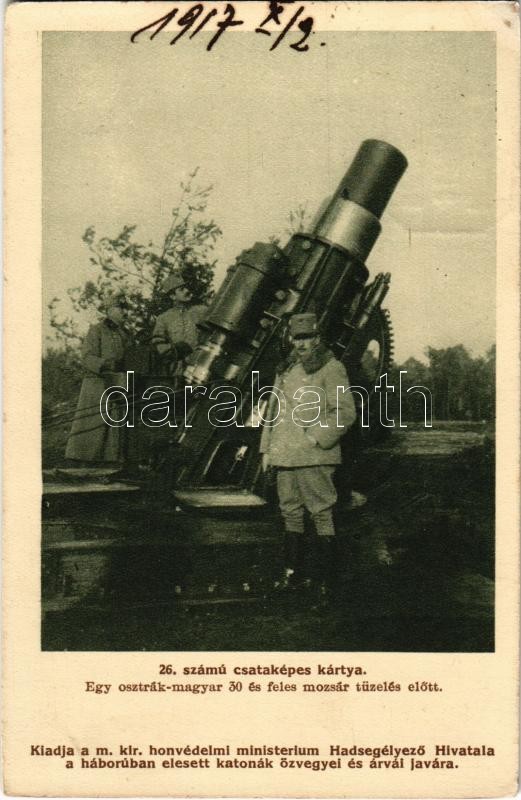 1917 26. számú csataképes kártya. Egy osztrák-magyar 30 és feles mozsár tüzelés előtt. Kiadja a M. kir. Honvédelmi Minisztérium Hadsegélyező Hivatala / WWI Austro-Hungarian K.u.K. military, soldiers with a 30,5 mortar cannon (Mörser) + "KISÖRSSZŐLŐHEGY POSTAI ÜGYN." bélyegző