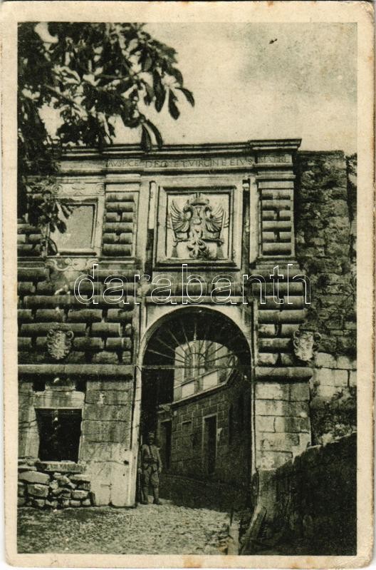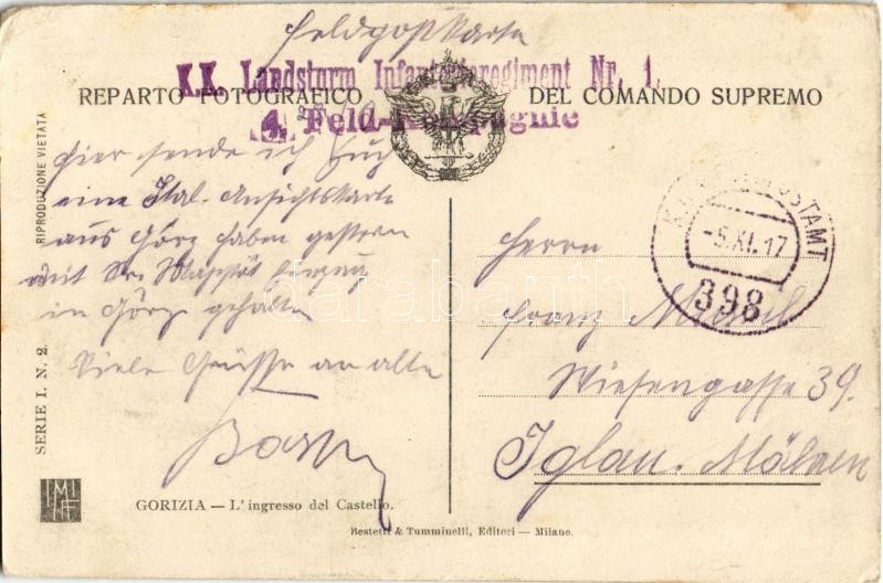 Leírás: 1917 Gorizia, Görz, Gorica; L'ingresso del Castello / WWI Austro-Hungarian K.u.K. military, castle entrance with soldier + "K.K. Landsturm Infanterieregiment Nr. 1. 4. Feld-Kompagnie" (kopott sarkak / worn corners)