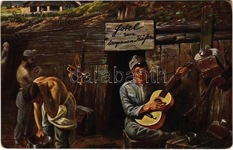 Nagymosás a lövészárokban / Waschtag im Schützengraben / WWI Austro-Hungarian K.u.K. military art postcard, laundry day in the trenches, soldier with guitar (kopott sarkak / worn corners)