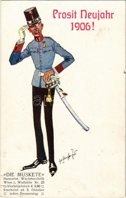 Prosit Neujahr 1906! "Die Muskete" Humorist. Wochenschrift Wien / Austro-Hungarian K.u.K. military art postcard with New Year greeting s: Schönpflug (b)