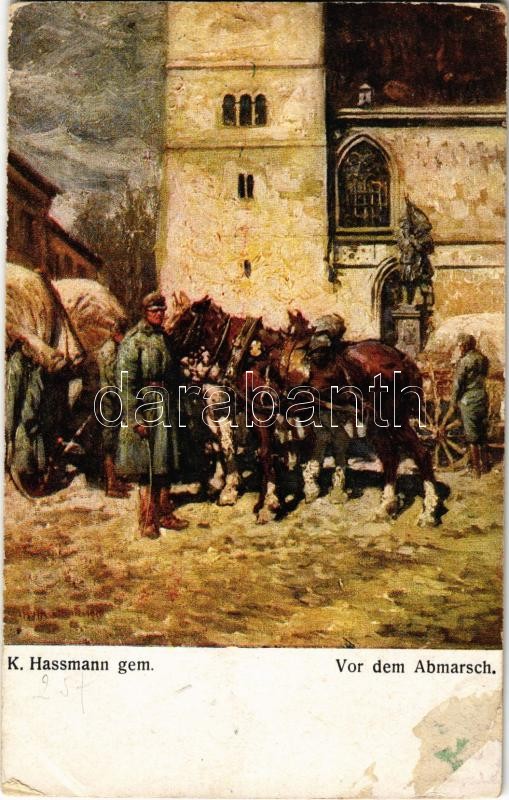 Vor dem Abmarsch. Offizielle Karte für Rotes Kreuz, Kriegsfürsorgeamt, Kriegshilfsbüro Nr. 257. / WWI Austro-Hungarian K.u.K. military art postcard, support fund s: K. Hassmann (felületi sérülés / surface damage)