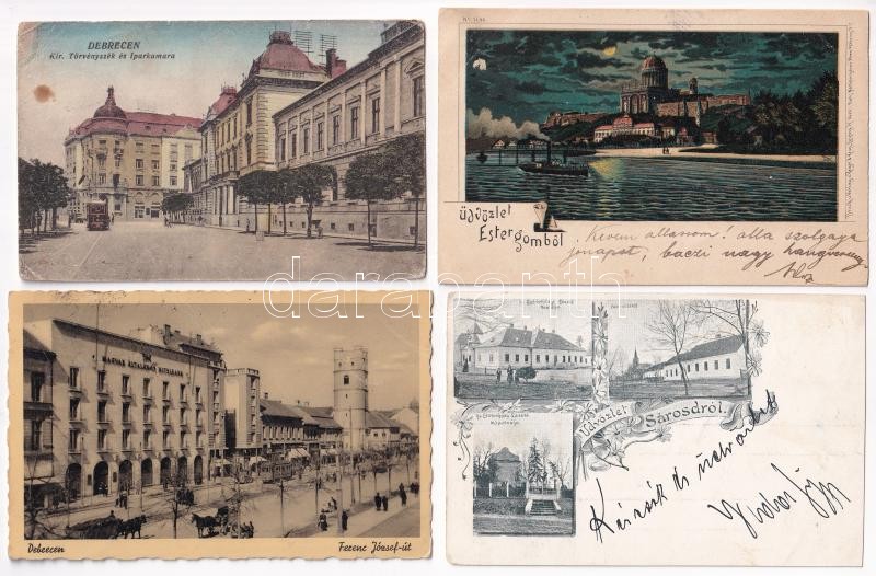 Leírás: 4 db RÉGI magyar város képeslap: Esztergom, Debrecen, Sárosd / 4 pre-1945 Hungarian town-view postcards