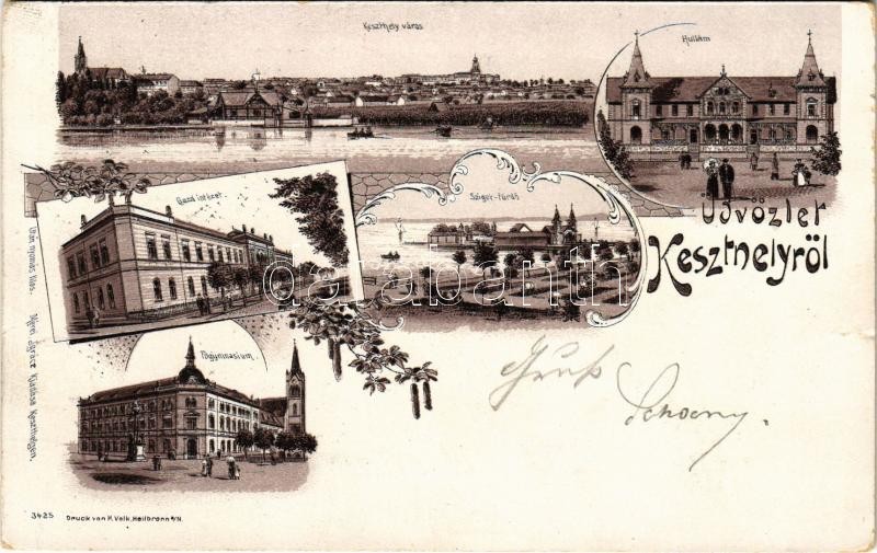 Leírás: 1898 (Vorläufer) Keszthely, Hullám szálloda, Sziget fürdő, Gazdasági intézet, Főgimnázium. Mérei Ignácz Art Nouveau, floral, litho (kis szakadás / small tear)